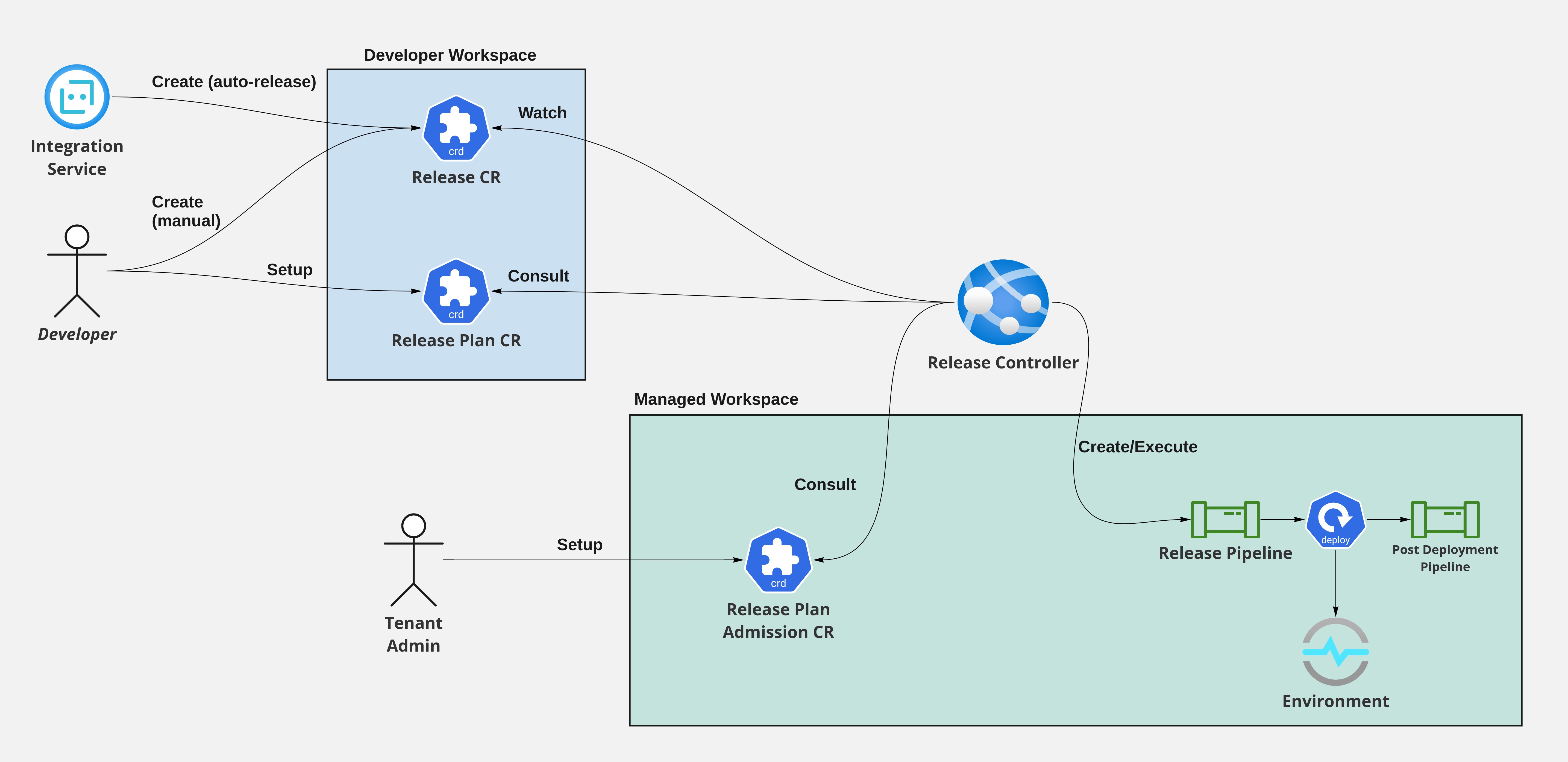 Additional custom resources are used to compose the system. ReleasePlan and ReleasePlanAdmission define the relationship between Development Workspaces and Managed Workspaces.